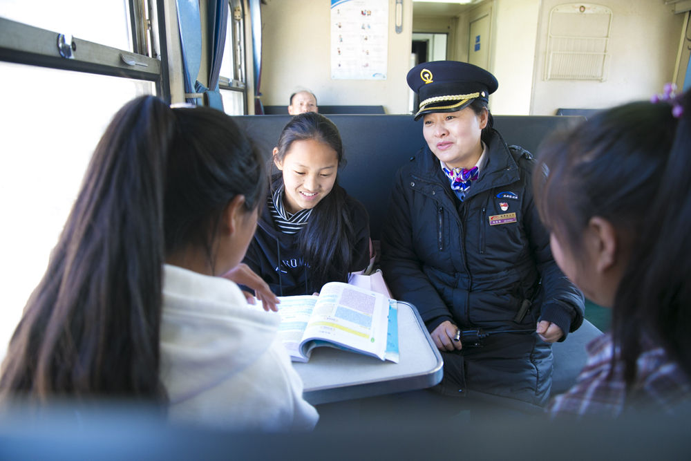 2019年2月28日,在“小慢车”上,列车长阿西阿呷给孩子们辅导作业,鼓励他们好好学习,走出大山,踏上成才的希望之路(2019年2月28日摄)。 新华社发 龚萱 摄
