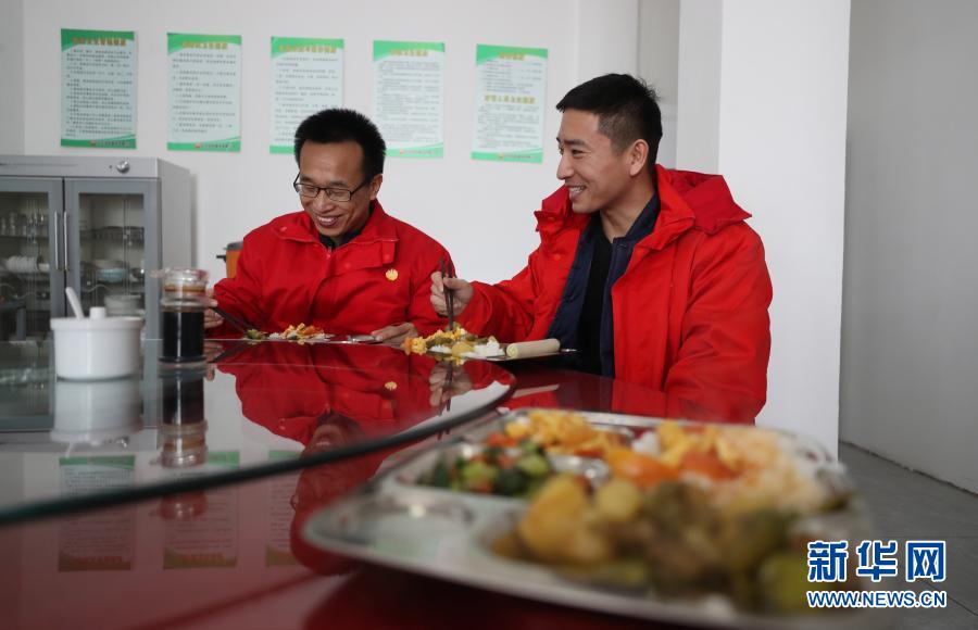 2月3日,在辽河油田建设有限公司管道第三项目部,来自河北衡水的概预算管理人员王殿凯(左)和来自河北邢台的工程技术人员张浩在食堂吃饭。今年他们都留在当地过年。