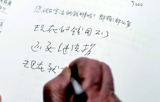 年事已高的方桂馥老人不能正常言语,与采访他的记者进行写字交流。记者问:“您现在生活的钱够吗?都捐了那么多。”他在纸上答道:“现在的钱用不了,还要继续捐,现在就捐。”(2018年1月23日摄)
