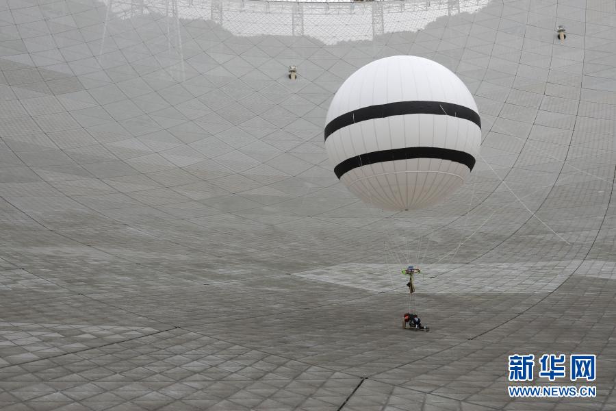 2019年8月30日,工作人员在FAST反射面板上实验“微重力蜘蛛人”方案。新华社记者 欧东衢 摄