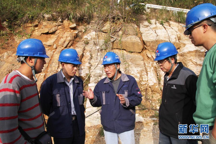 南仁东(中)与工程技术人员在大窝凼施工现场检查施工进展(2014年12月1日摄)。新华社发(中科院国家天文台供图)