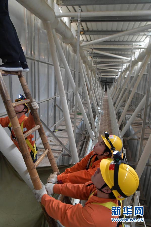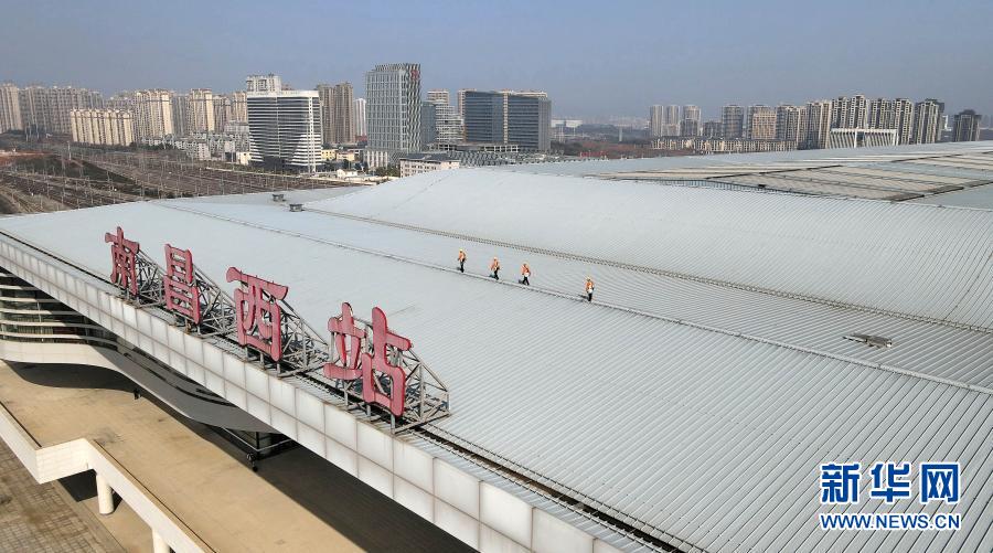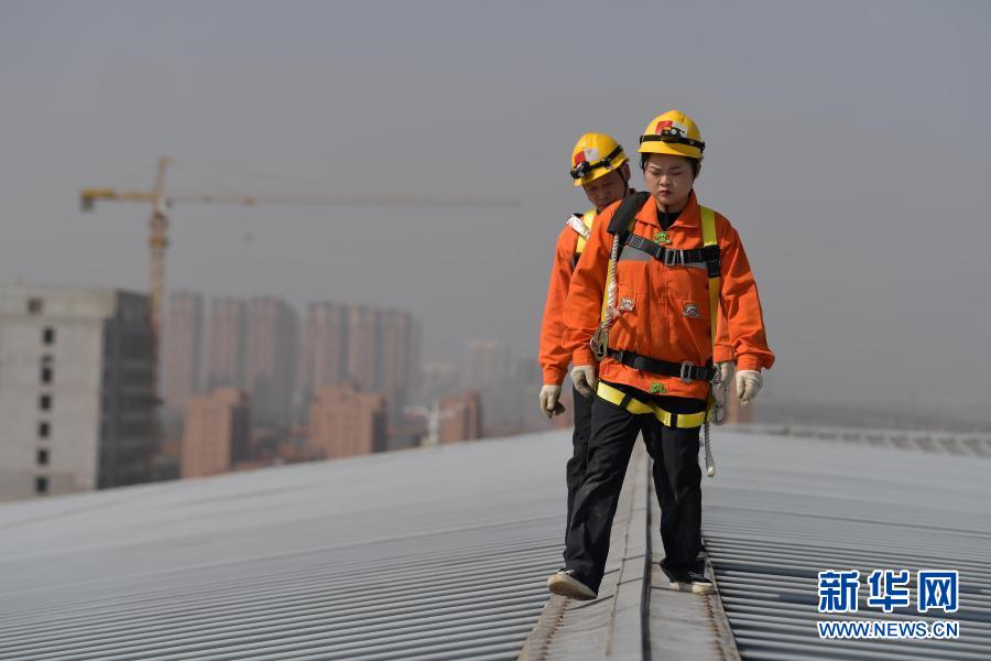 1月29日,在南昌西站站房顶部,李蓉曼(前)和同事前去检修电力设备,他们每一步必须踩在建筑的龙骨结构上,不然容易发生安全意外。新华社记者 彭昭之 摄