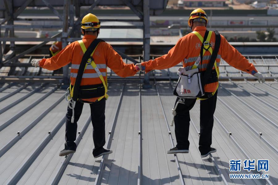 1月29日,在南昌西站站房顶部,李蓉曼(左)和同事手拉手前去检修电力设备,他们每一步必须踩在建筑的龙骨结构上,不然容易发生安全意外。新华社记者 彭昭之 摄