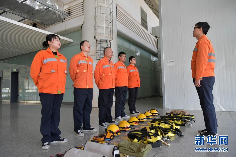 1月29日,在南昌西站,李蓉曼(左一)和同事们列队准备穿戴装备。新华社记者 彭昭之 摄