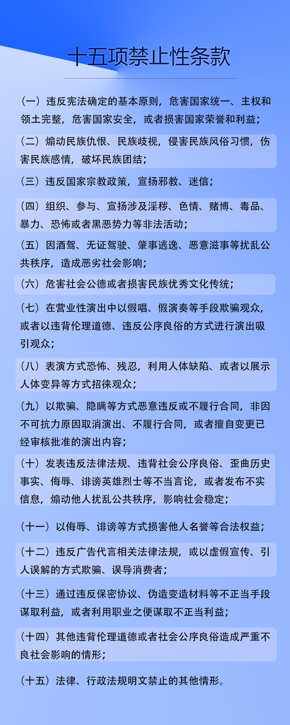 其中,演艺人员不得出现以下十五项行为: