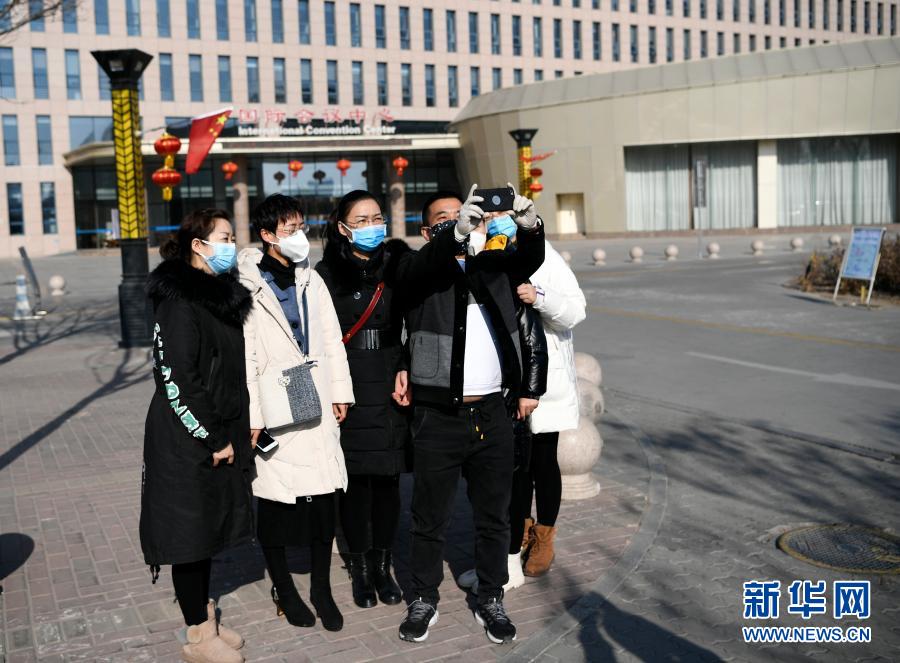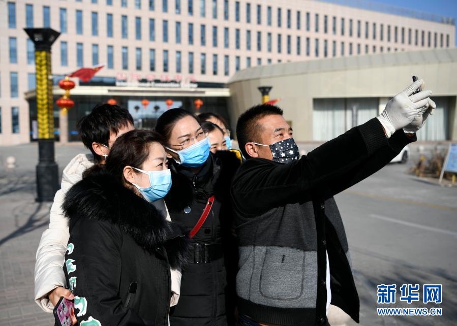 王晶在将医护人员送到后,与她们合影留念(2020年1月31日摄)。新华社记者 王鹏 摄