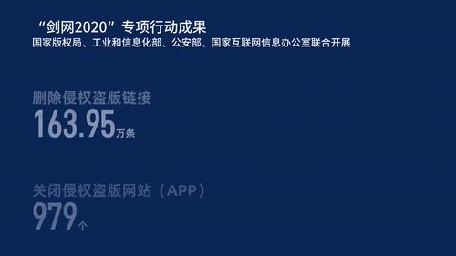 在这场国家版权局、工业和信息化部、公安部、国家互联网信息办公室联合开展的“剑网2020”专项行动中,共删除侵权盗版链接323.94万条,关闭侵权盗版网站(App)2884个,查办网络侵权盗版案件724件。