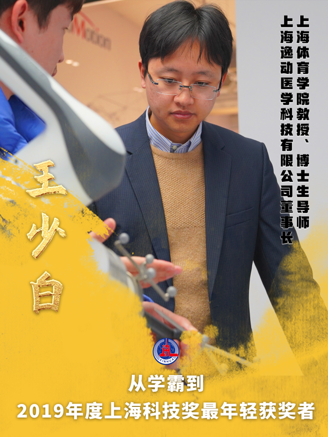 他就是上海体育学院创新创业学院副院长、上海逸动医学科技有限公司创始人王少白。出生于1985年,他曾以运动生物力学、骨科医疗和康复领域的一系列产品创新及研发成果获得2019年度上海市青年科技杰出贡献奖,是当年度最年轻获奖者。