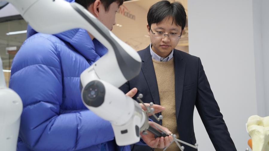 王少白与同事进行手术机器人研究。新华社记者 袁全 摄
