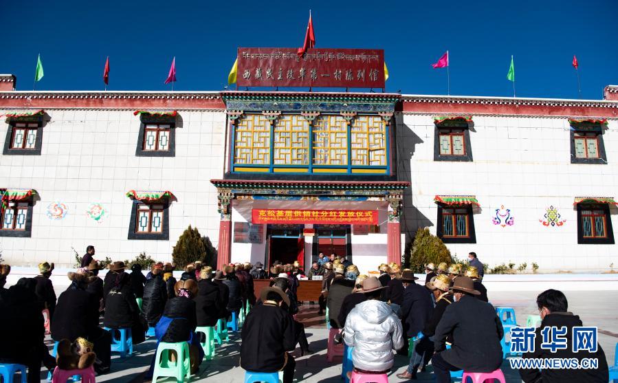 2月9日,西藏自治区供销合作社社有企业——西藏领峰田舍益家公司负责人赵全(左一)给当地群众发放分红。新华社记者 普布扎西 摄
