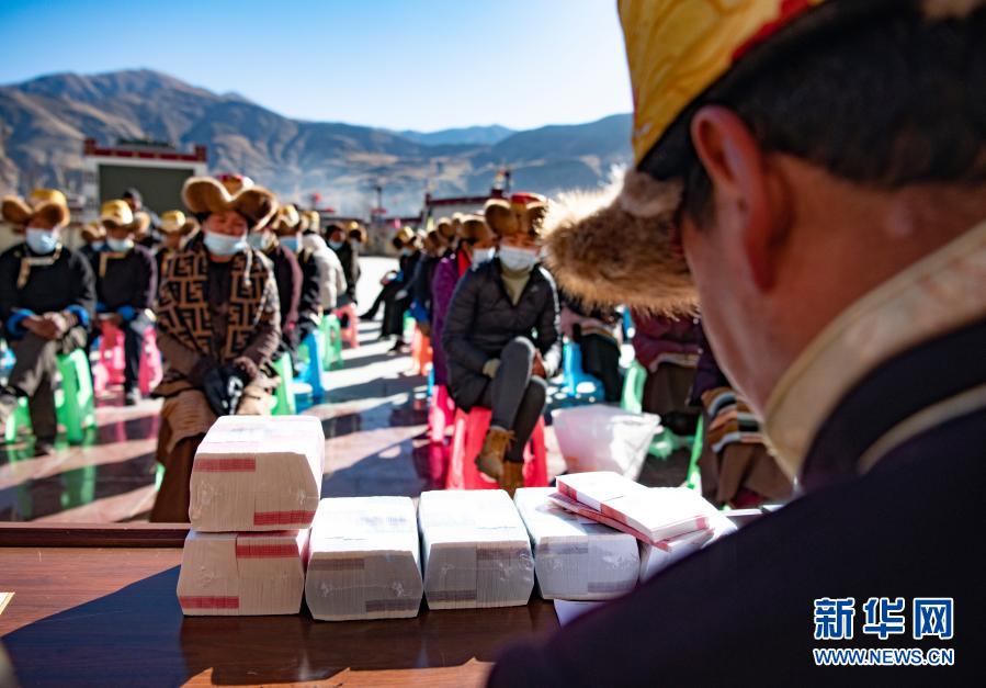 2月9日,在西藏民主改革第一村——山南市乃东区克松村社区,农民依次领取崭新的百元钞票,为即将到来的藏历新年增添了喜庆的氛围。新华社记者 普布扎西 摄