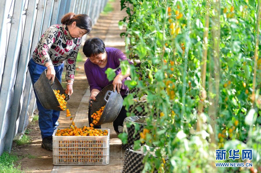 2月2日,在呼和浩特市经济作物工作站引种试验示范基地,工作人员收获越冬茬口感型番茄。新华社发(王正 摄)