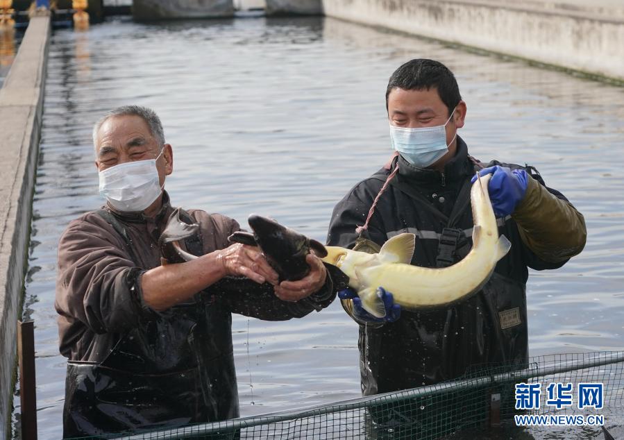 2月4日,河北省井陉县上坡头村绿野渔业养殖合作社社员展示刚捕捞的鲟鱼。新华社记者 杨世尧 摄