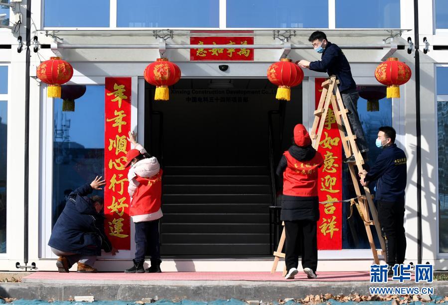 2月6日,在河北省石家庄市桥西区一处工地项目部,志愿者与工人们一起挂灯笼。新华社记者 王晓 摄