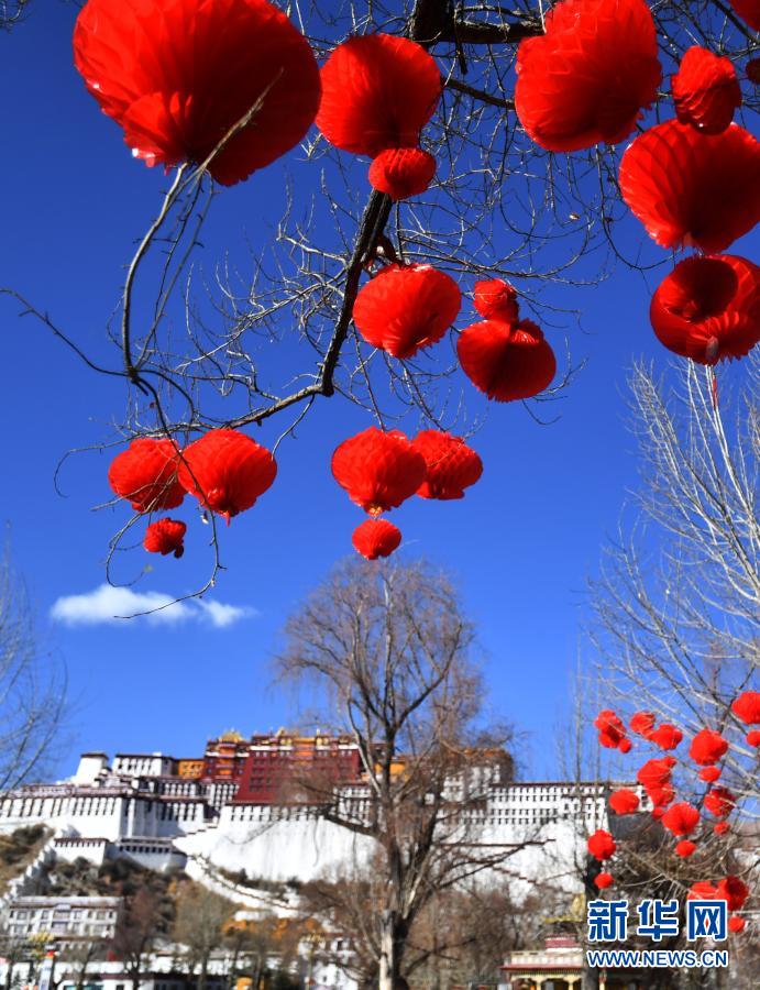 2月8日拍摄的拉萨布达拉宫前的红灯笼。新华社记者 觉果 摄