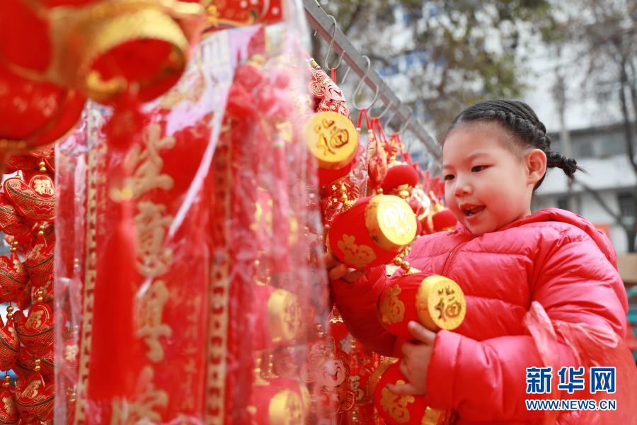 2月10日,一名小朋友在安徽省淮北市一年货市场挑选新年饰品。新华社发(万善朝 摄)