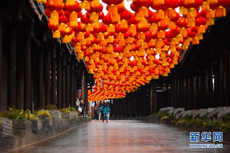 重庆市酉阳土家族苗族自治县酉州古城街道上挂起了红灯笼(2月10日摄)。新华社发(陈碧生 摄)