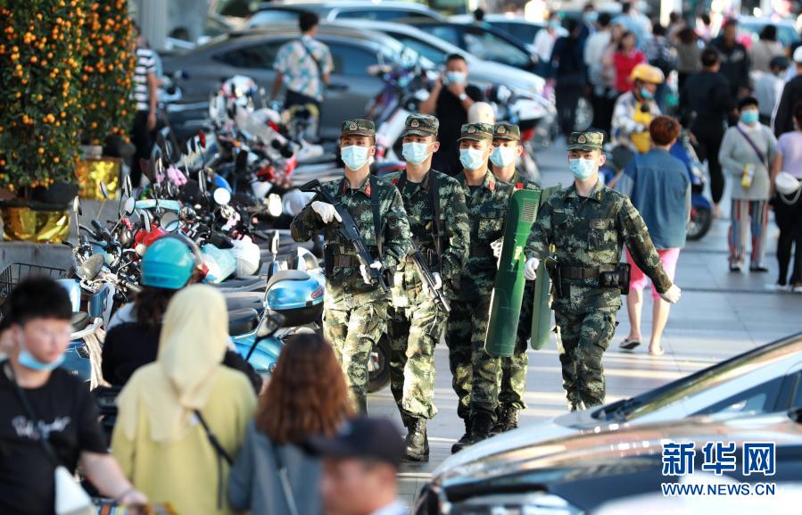 2月11日,武警湖南总队衡阳支队官兵在衡阳解放路巡逻执勤。 新华社发(范一凡 摄)