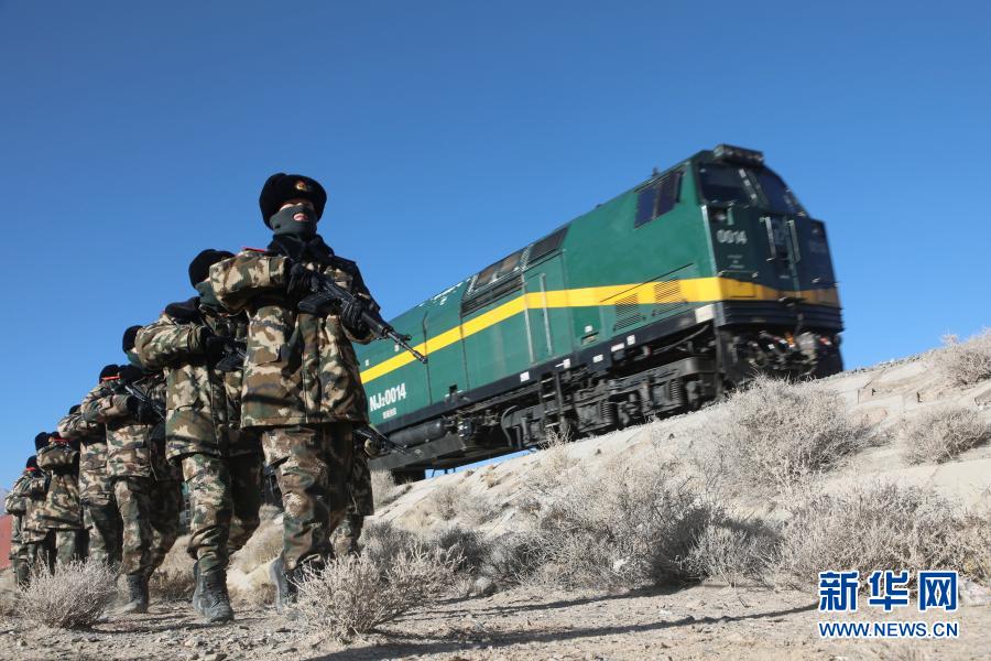2月11日,武警青海总队执勤支队官兵在青藏铁路昆仑山隧道至五道梁路段巡逻执勤。 新华社发(杨浩 摄)
