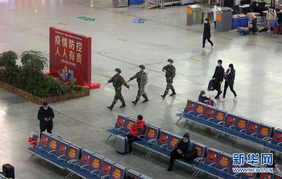2月11日,武警广东总队广州支队官兵在广州南站巡逻执勤。 新华社发(程长英 摄)