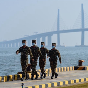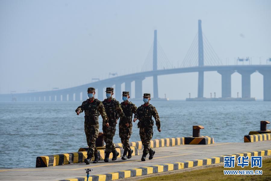 2月11日,武警广东总队执勤第二支队官兵在港珠澳大桥珠澳口岸人工岛巡逻执勤。 新华社发(张乐 摄)