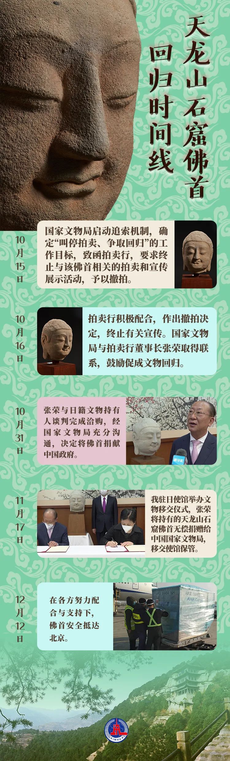 2020年9月14日,国家文物局监测发现,日本东瀛国际拍卖株式会社拟于东京拍卖一尊“唐 天龙山石雕佛头”,疑似山西省太原市天龙山石窟在历史上流失的文物。曲折而振奋的追索行动就此展开——