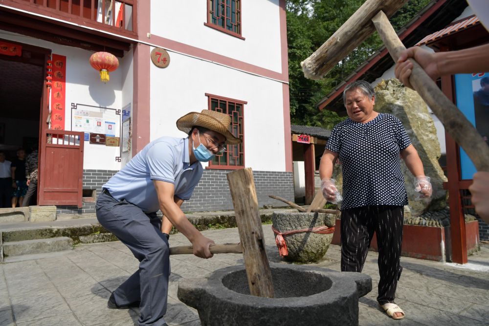 在神山村里,每家每户舂糍粑是村里的春节习俗,游客们感受红色文化,体验打糍粑、品尝土特产的乐趣。