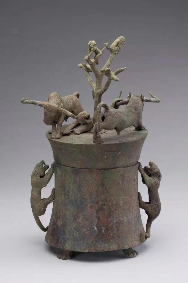 长期以来,牛给人的印象是忠厚老实,可这件贮贝器上的两头牛却是尽显“王者之态”。有学者表示,彪悍的峰牛能将百兽之王逼入绝境,或是墓主生前征服劲敌开疆扩土的真实写照。“猴子都惊得爬上了树,这搏斗场面得有多激烈!”云南省博物馆馆长马文斗说。
