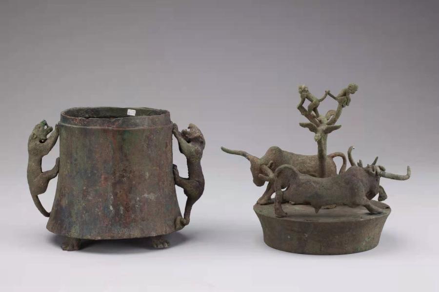 贮贝器上牛搏斗的特写。云南省博物馆供图