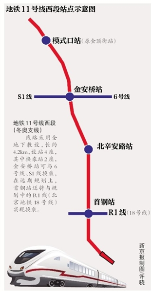 “冬奥支线”采用全地下敷设,线路长约4.2km,设站4座,分别为模式口站(原金顶街站)、金安桥站、北辛安路站、首钢站。其中换乘站2座,金安桥站可与6号线、S1线换乘,在远期规划上,首钢站还将与规划中的R1线(北京地铁18号线)实现换乘。
