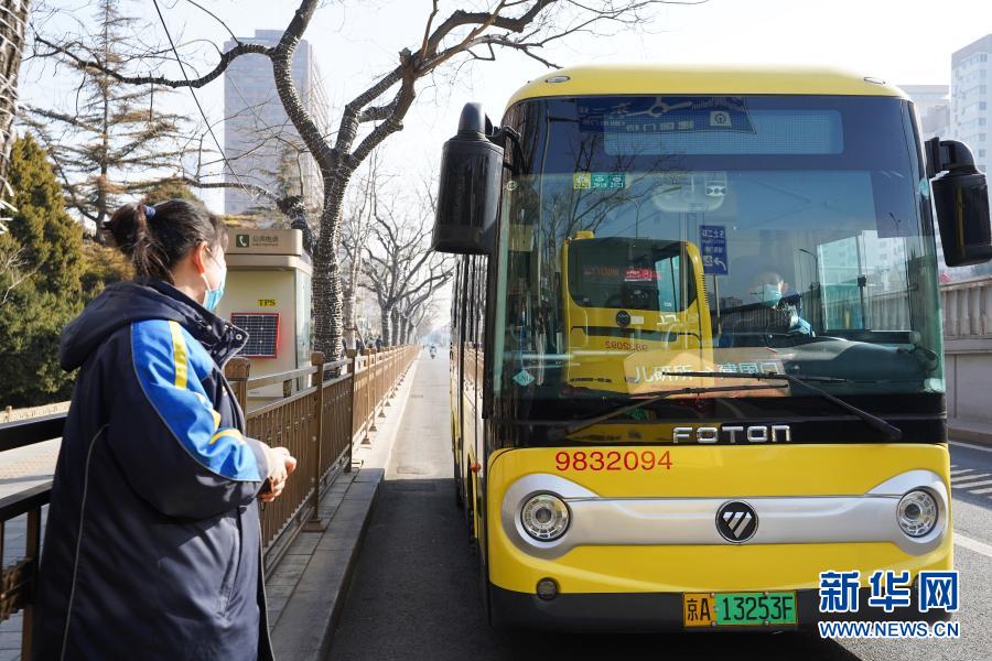 在地铁建国门站,柴丽莉(左)在等候姜楠驾驶的公交车进站(2月10日摄)。新华社记者 鞠焕宗 摄
