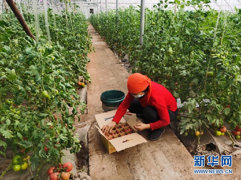 村民薄素梅正在将西红柿采摘装箱。新华社记者 王劲玉 摄