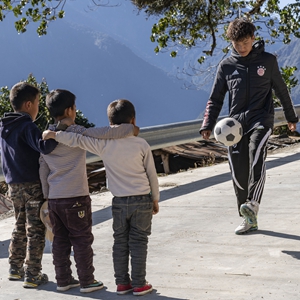 在西藏林芝市墨脱县德兴乡巴登则村,旺前罗布向弟弟们展示自己的球技(2月9日摄)。新华社记者 孙非 摄
