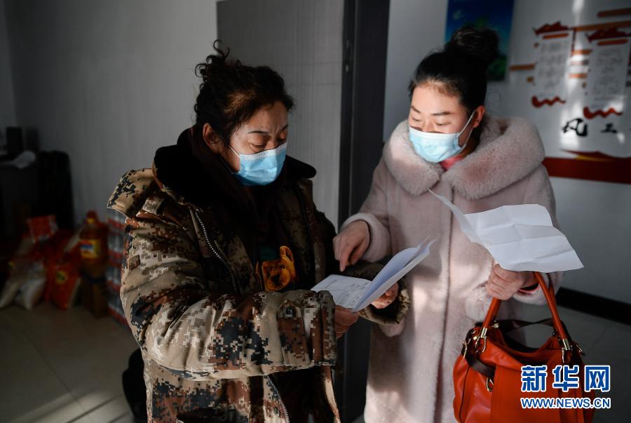 赵淑华(左)查看一位社区居民的核酸检测报告等相关防疫文件(2月15日摄)。新华社记者 许畅 摄