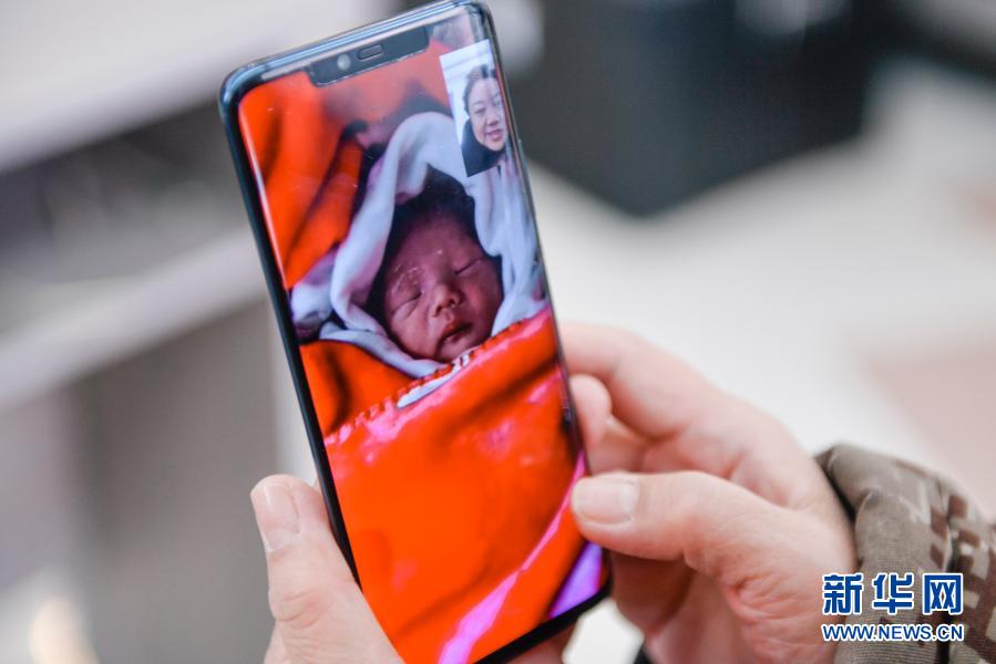 赵淑华与她的儿子、儿媳视频连线,隔空看到了当日出生的孙子(2月16日摄)。新华社记者 许畅 摄