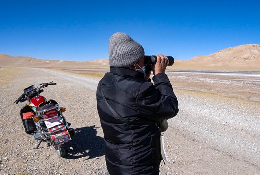 在巡逻过程中,次成塔青发现了一小群藏羚羊,他特意隔开一段距离,左手掏出望远镜小心地观察,右手拿笔在观察记录本上记下发现藏羚羊群的地点、时间,种群的数量及性别等情况。