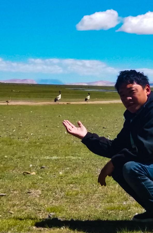 次成塔青和黑颈鹤合影(2020年6月摄)。(受访者供图)