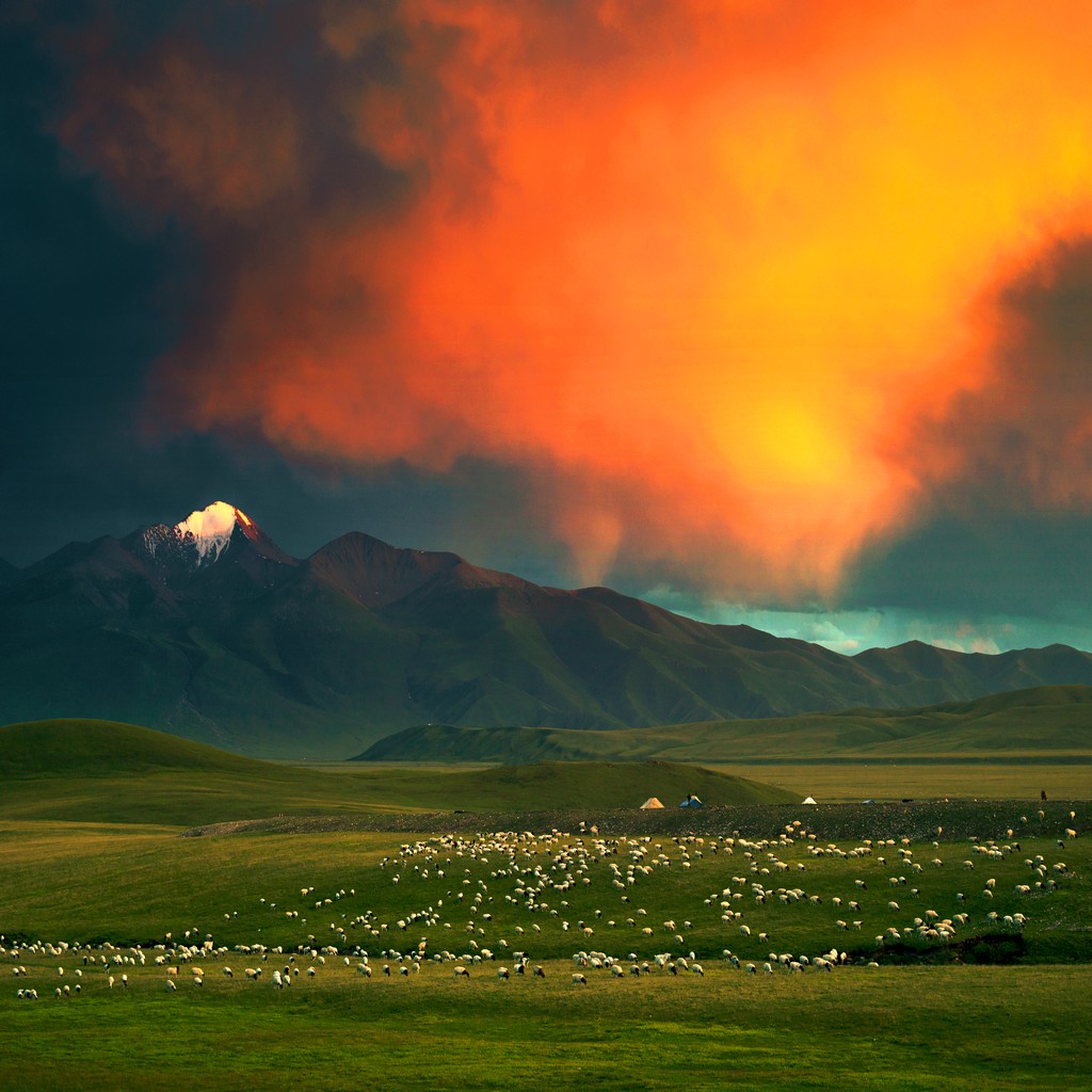 火红的晚霞映照汗腾格里峰,洁白的羊群像一颗颗珍珠洒落在天山草原上。李学亮 摄影
