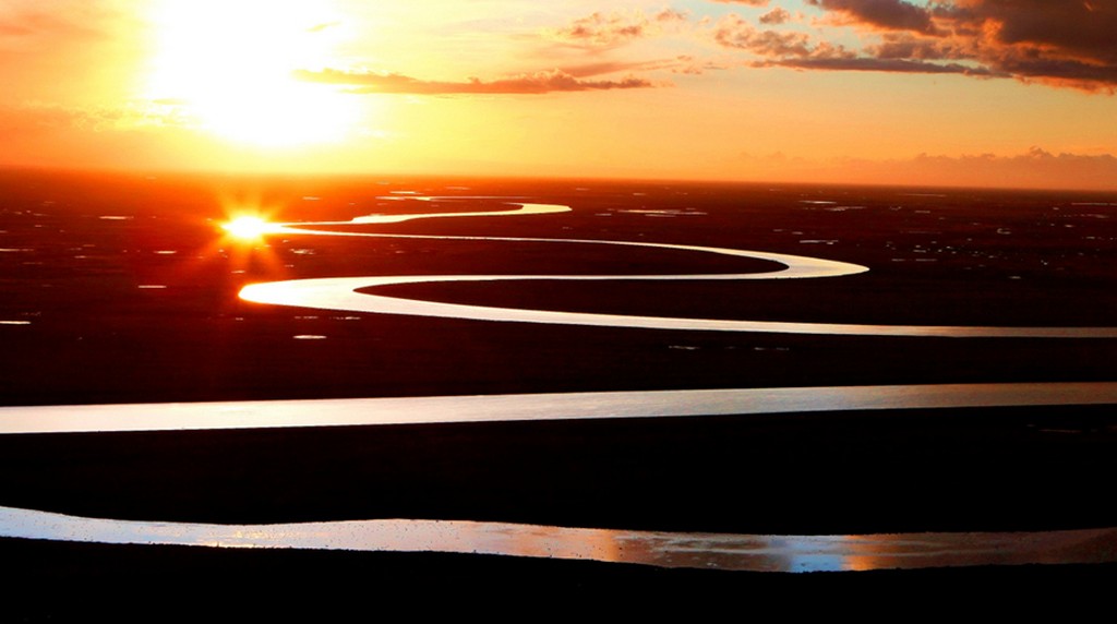 巴音布鲁克草原上,九曲十八弯的“天鹅河”流向远方。 朱金平 摄影