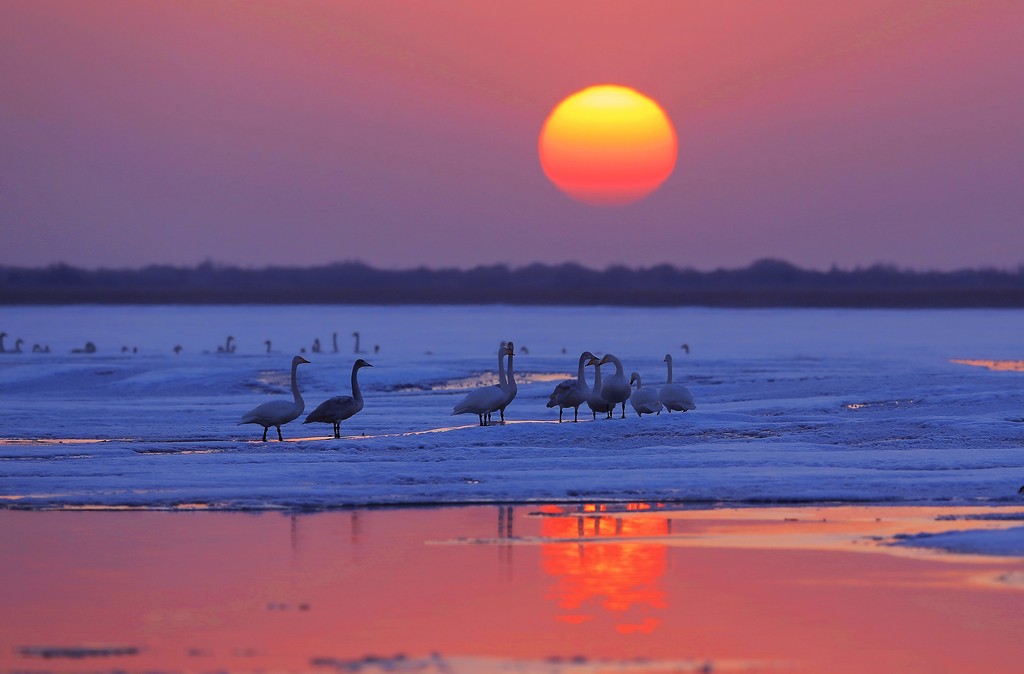 沙雅县托依堡镇库木艾力克村塔里木河畔的湿地,前来过冬的白天鹅栖息在落日里。阿不力克木·居曼 摄影