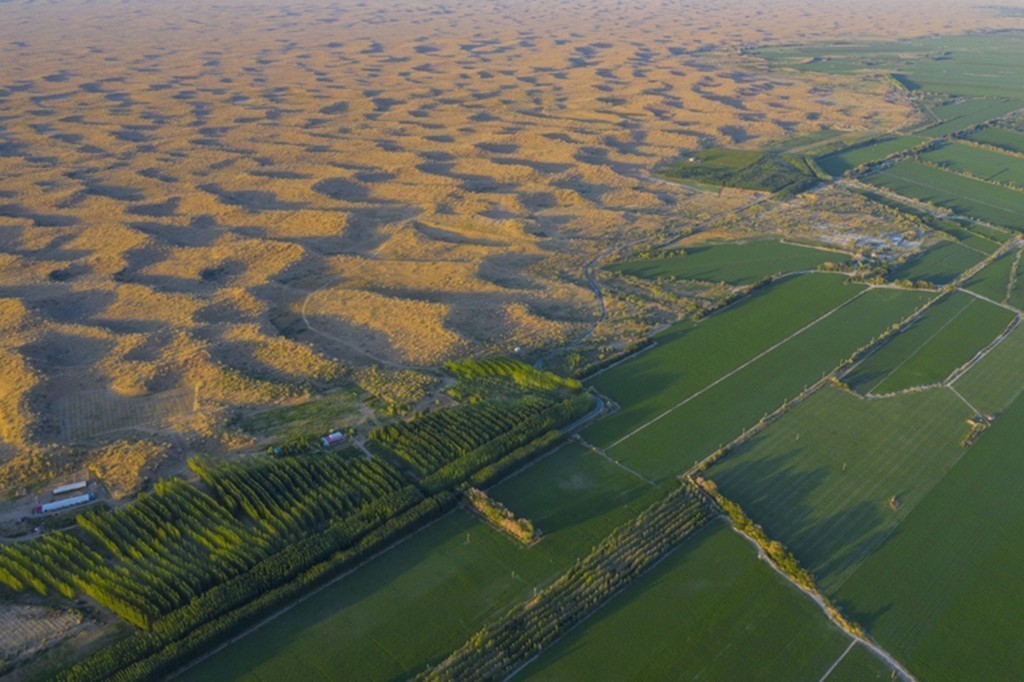 在三北防护林的新疆生产建设兵团第八师121团库尔班通古特沙漠南缘,绿色植被正一步步向黄色沙漠延伸。王梓林 摄影