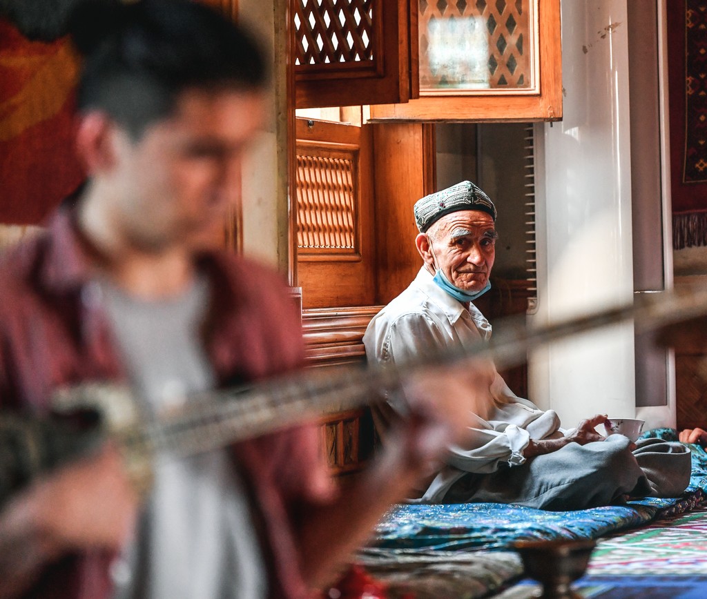 位于喀什老城的百年老茶馆里,老茶客正凝望着艾孜麦提(前)弹奏热瓦甫。艾孜麦提考入了中央音乐学院,专修热瓦甫演奏专业。马 锴 摄影