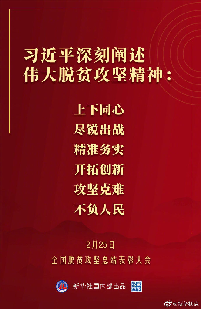 脱贫攻坚伟大斗争,锻造形成了“上下同心、尽锐出战、精准务实、开拓创新、攻坚克难、不负人民”的脱贫攻坚精神。脱贫攻坚精神,是中国共产党性质宗旨、中国人民意志品质、中华民族精神的生动写照,是爱国主义、集体主义、社会主义思想的集中体现,是中国精神、中国价值、中国力量的充分彰显,赓续传承了伟大民族精神和时代精神。