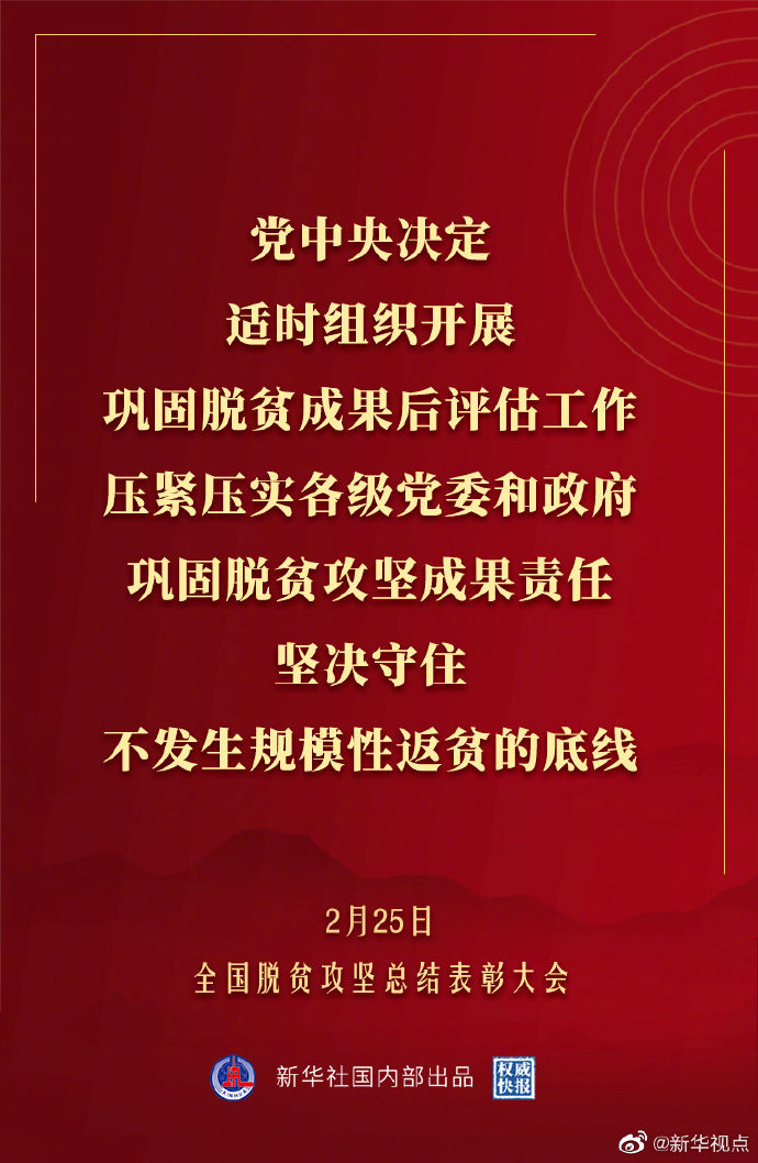 习近平在讲话中说,党中央决定,适时组织开展巩固脱贫成果后评估工作,压紧压实各级党委和政府巩固脱贫攻坚成果责任,坚决守住不发生规模性返贫的底线。