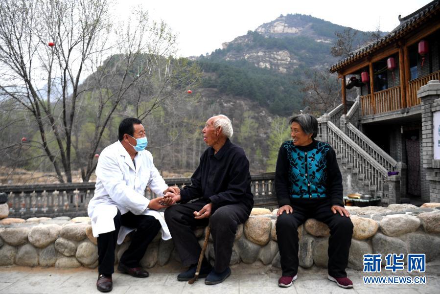 在河北省阜平县龙泉关镇骆驼湾村,村医霍建国为村民把脉(2020年4月15日摄)。骆驼湾村曾经是当地有名的特困村,608口人中428人属贫困人口,如今早已脱贫摘帽。