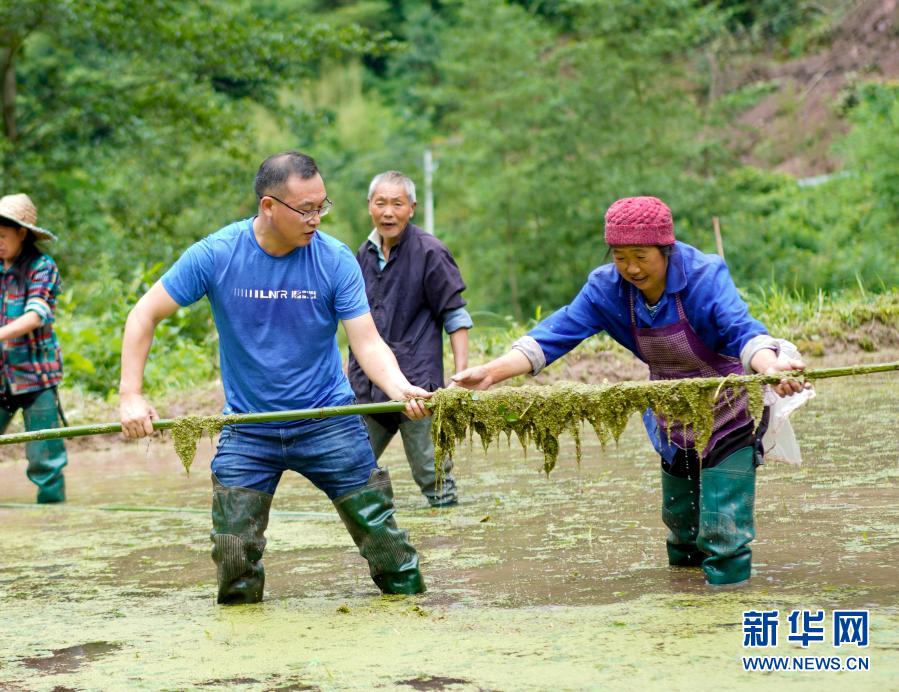重庆市石柱土家族自治县中益乡华溪村驻村第一副书记罗风华(前左)在莼菜田里和金溪村民小组的村民清理浮萍(2020年7月7日摄)。中益乡曾是重庆18个深度贫困乡镇之一,重庆专门下派驻乡扶贫工作队,各村配齐驻村书记,帮着村里搞规划、建项目、促脱贫。在扶贫干部的带动下,中益乡发生了翻天覆地的变化。