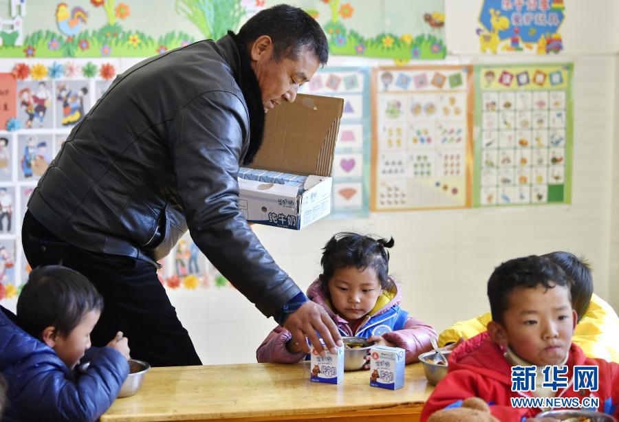 西藏山南市贡嘎县吉雄镇红星社区双语幼儿园的老师为孩子们分发牛奶(2020年11月25日摄)。近年来,随着国家在增加投入、完善政策、扩大规模、补充教师、规范管理等方面不断加大工作力度,西藏学前教育迎来发展黄金期。