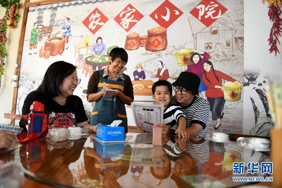 游客在石家庄市平山县岗南镇李家庄村一户农家乐里点菜(2020年9月16日摄)。 河北省石家庄市平山县是革命老区。近年来,该县以红色旅游为核心,大力实施“旅游+发展”模式,推进红色旅游与脱贫攻坚、乡村振兴、生态建设、文化产业融合发展,引导百姓经营农家乐、销售农副产品等,催生出西柏坡红色小镇、李家庄美丽乡村等一批新景点。