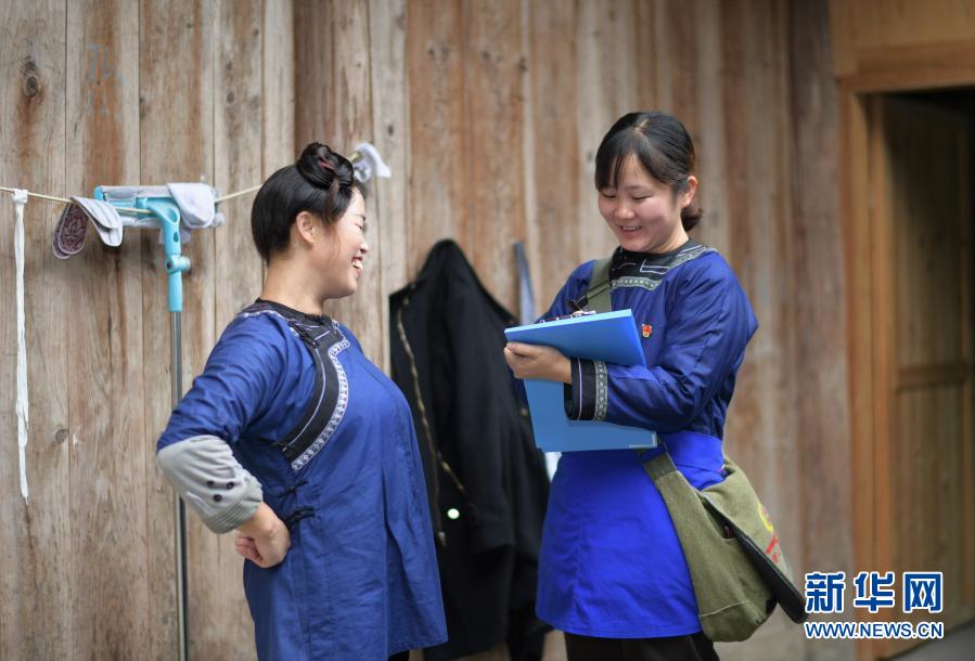 贵州省黔东南苗族侗族自治州榕江县平江镇巴鲁村网格员刘园(右)走访结对帮扶户时,与村民韦福琴核对生产生活情况(2020年11月16日摄)。32岁的共产党员、退伍军人刘园是榕江县退役军人事务局的一名侗族干部,她2019年11月到巴鲁村担任网格员后,全身心投入脱贫攻坚工作。