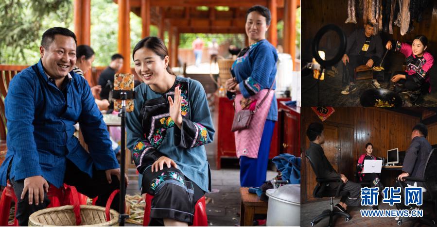 这是一张拼版照片,左图为:十八洞村扶贫队长麻辉煌(左)与返乡大学生施林娇(中)在湖南湘西十八洞村,一起直播推销土特产(2020年5月15日摄);右上图为:施林娇(右)在直播中向观众展示炒好的腊肉(2020年4月23日摄);右下图为施林娇(中)在工作室内和施康(左)、施志春(右)一起商讨直播内容(2020年4月23日摄)。